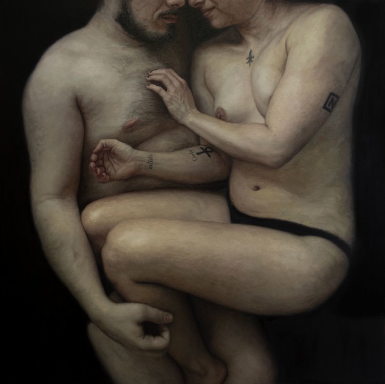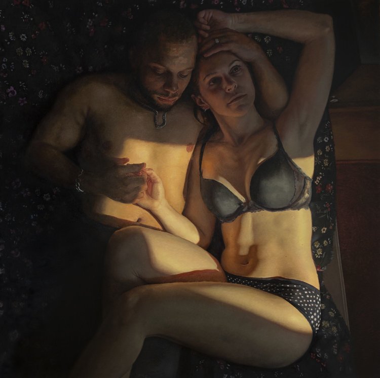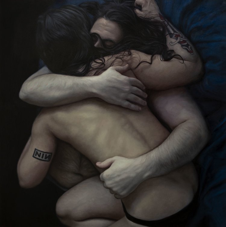 Therefore my paintings can be thought of as intentional meditations on feelings of love and celebrations of the creative force. It feels important to render those ideas in a real and honest way. To be authentic I think the concept needs to be reflected in the rendering style and the aesthetic into the meaning. When I work in the sometimes meticulous way I do, I ask myself, “What does it feel like to be in a healthy loving, intimate moment?”. But I also wonder, “What does the fabric feel like?” Or, “How would the warmth of a breath feel across the skin of a neck or how the weight of the flesh would feel folded or laying across another body? These are the intimate details of the sacred and beautiful moments of our lives. I sometimes imagine that in the final moments of my life, I will recall all these intimate, loving moments and there find a comfortable peace. These intimate feelings will be what mattered most. They require a certain attention and respect in regard to the message.